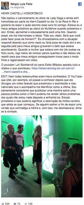 Em seu depoimento no Facebook, Sérgio Luiz Felix, o rapaz que pediu a foto, confirma a atitude homofóbica. "Não bastou o cancelamento do show da Lady Gaga e ainda sofri homofobia por parte do Henri Castelli no dia 15 do Rock in Rio. Gostaria de expor o quão escroto esse cara foi comigo. Estava eu e meus amigos próximos ao stand da Multishow quando avistamos o ator. Então, aproximei e educadamente pedi uma foto. Quando posei, ele me interrompeu e disse: 'Não sou viado. Será que você pode fazer pose de homem?'. Eu, chocadíssima com a situação, respondi dizendo que como viado eu faria pose de viado, sim. E em seguida pedi para meus amigos gravarem o bafo que estava acontecendo. Quando a mulher que estava com ele (de costas na foto) ouviu, logo tratou de colocar panos quentes e não deixou ele repetir para que meus amigos conseguissem trocar para o modo filme e registrassem em vídeo", relatou Felix.