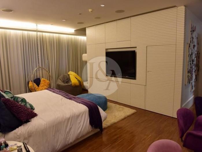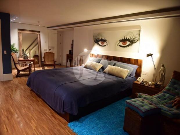 A mansão possui 2.626 m² de área construída, com amplos cômodos distribuídos em hall de entrada, sala de estar, sala de jantar, sala de TV, três lavabos, varanda aberta, jardim de inverno, escritório, cozinha gourmet, seis suítes, closet, cozinha, copa separada, suíte para governanta, despensa, louceiro, área de serviço, lavanderia, duas dependências completas no subsolo. A área externa conta ainda com piscina, espaço gourmet, jardim, canil e anexo com sala de ginástica e pilates, sauna a vapor, spa, hidromassagem e vestiário. A mansão tem garagem para pelo menos oito carros. O condomínio oferece portaria e vigilância 24 horas.