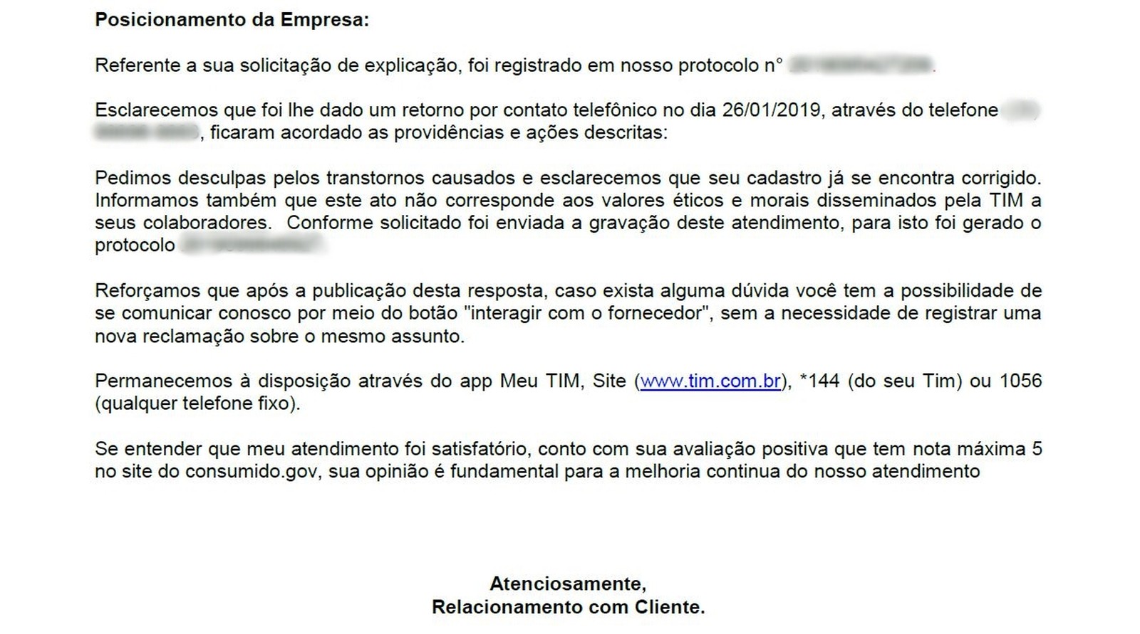 Na carta enviada ao cliente no dia 26 de janeiro, a Tim alega que tomou providências. "Pedimos desculpas pelos transtornos causados e esclarecemos que seu cadastro já se encontra corrigido. Informamos também que este ato não corresponde aos valores éticos e morais disseminados pela Tim e seus colaboradores", explica em trecho da carta. Veja trecho do documento abaixo: