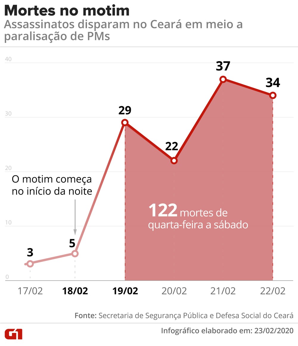 Desde o início do motim dos policiais do Ceará, na quarta-feira, foram 122 homicídios no estado, uma média de 30,5 por mês. Antes do início do motim, a média de homicídios neste ano era de seis por dia.